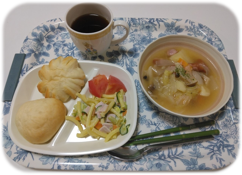 今日のメニューはマカロニサラダとポトフと手作りパンです。おいしそうでしょう?